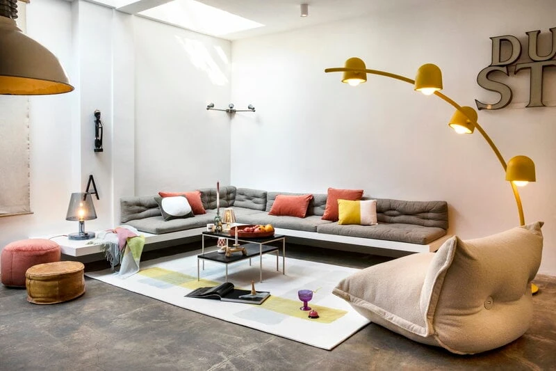 Der von Carole Baijings für Fatboy entworfene Teppich Colour Blend ist mit einem grafischen Motiv aus vier verschiedenfarbigen Linien verziert, die wie ein riesiges Zahlenzeichen aussehen. Baijings, die für ihre Farbkompetenz bekannt ist, kam ganz spontan auf die Muster- und Farbkombinationen: Beim Skizzieren der Teppiche fiel ihr auf, dass die sich kreuzenden Farben neue Schattierungen, sozusagen Farbmischungen, ergaben, und so nahm das Design wie von selbst Gestalt an. Darüber hinaus ist der Teppich aus einem besonders weichen Material gefertigt, das die verschwommenen, asymmetrischen Linien und Schichten von Baijings‘ ursprünglichem Entwurf perfekt ergänzt.
