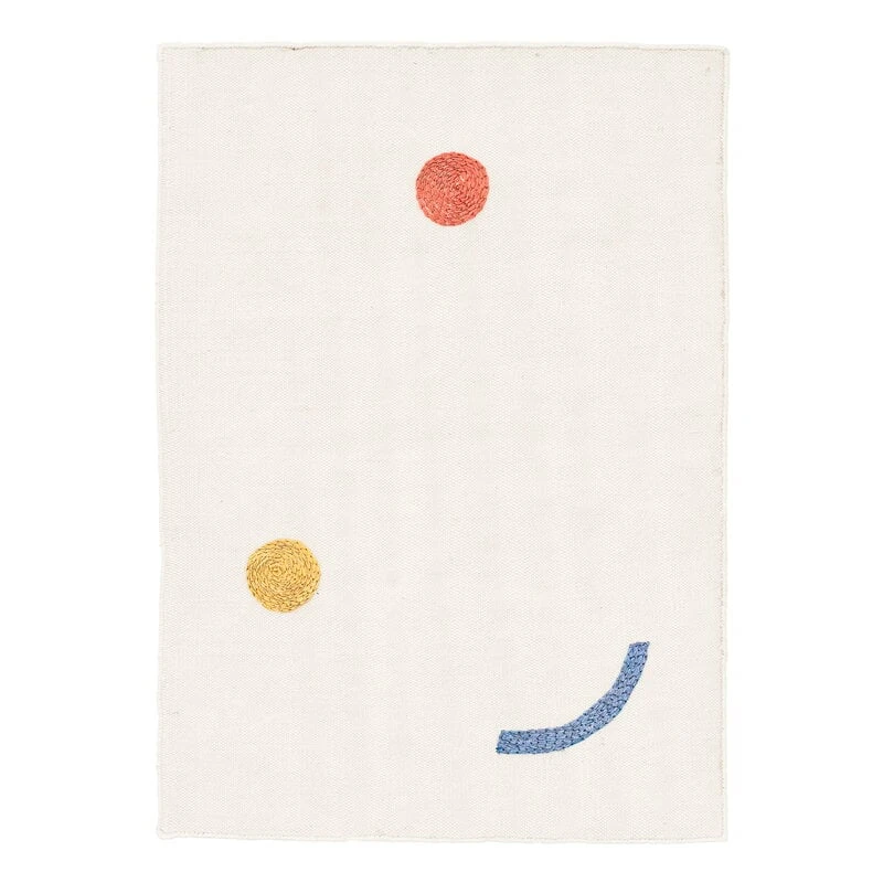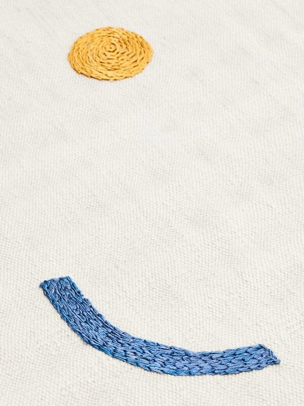 Der Hymiö-Teppich wird in Indien handgefertigt, wobei das Muster sorgfältig von Hand gestickt wird. Obwohl der Teppich in Aussehen und Textur einem dicht gewebten Wollteppich ähnelt, besteht er in Wirklichkeit aus einem eher überraschenden Material: recycelten PET-Plastikflaschen. Dank des ausgeklügelten Materials ist der Teppich sehr langlebig, pflegeleicht und auch für den Außenbereich geeignet, sieht jedoch nicht wie ein Teppich für den Außenbereich aus. Er ist genauso gut für Innenräume, Balkone und Terrassen geeignet!