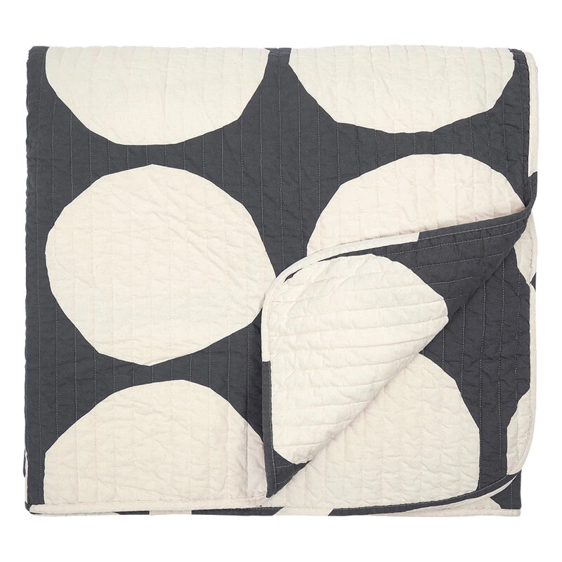 Der Kivet-Bettüberwurf von Marimekko ist mit einem Muster aus gezackten Kreisen verziert, das von Maija Isola im Jahr 1956 entworfen wurde. Kivet ist ein finnisches Wort für Steine. Kivet wurde von großen Felsen inspiriert, die im Atelierhof der Künstlerin ausgegraben wurden. Das Kivet-Muster ist in Anthrazitfarben und ungebleichter Baumwolle gestaltet und verleiht dem Bettüberwurf eine dynamische und zugleich natürliche Ausstrahlung.