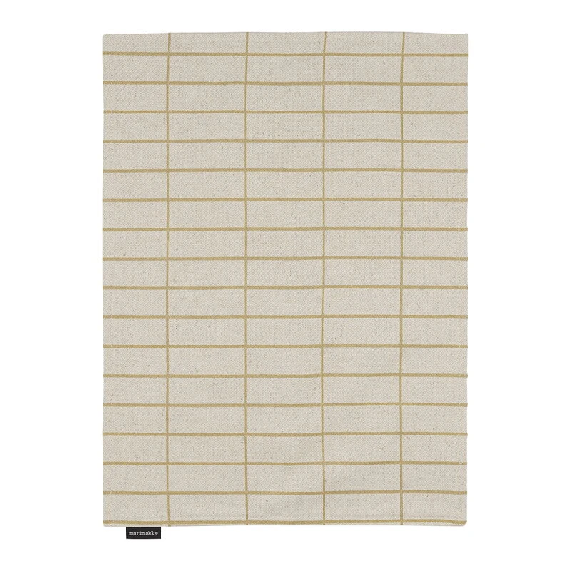Das aus Baumwoll-Leinen-Mix gefertigte und mit goldenen Streifen und genähten Kanten versehene Pieni-Tiiliskivi-Tischset verleiht jeder Art von Tischdekoration Charakter.