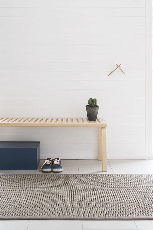 Der Teppich Panama des finnischen Herstellers VM Carpet zeichnet sich durch eine raue, strapazierfähige Oberfläche aus, die aus natürlichem Sisal gewoben ist. Der Teppich Panama ist ideal für Flure, Gänge und öffentliche Räume. Er verfügt über eine schmutzabweisende Oberflächenbeschichtung und eine rutschfeste EVA-Rückseite. Das recycelbare und geruchsneutrale Material der Rückseite ist für alle Bodenarten geeignet, auch für Strahlungsheizung. Der Teppich wird in der VM Carpet-eigenen Teppichfabrik im finnischen Dorf Karvala hergestellt.