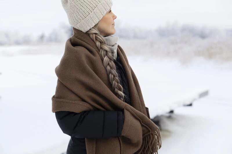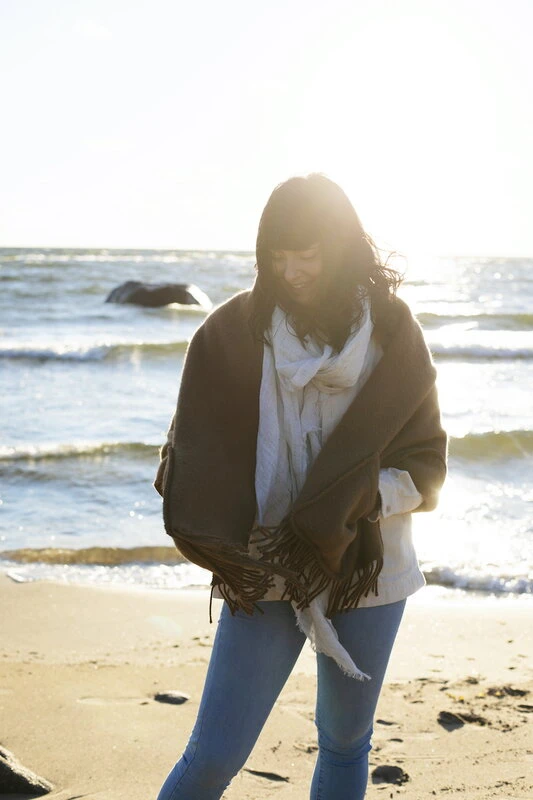 Die Uni-Stola mit Taschen von Lapuan Kankurit hält Sie auch an den kältesten Wintertagen warm. Sie wird aus mulesingfreier neuseeländischer Wolle hergestellt, die sich selbst auf nackter Haut weich und angenehm anfühlt. Dank der praktischen Taschen bleiben auch Ihre Hände warm. Die Fransen geben der Stola den letzten Schliff. Legen Sie sich die Uni-Stola zu Hause über die Schultern, wenn die Temperaturen draußen fallen, oder wickeln Sie sich im Büro oder auf der Terrasse in diese stilvolle Stola. Die Stola mit Taschen wird in einer Näherei in Litauen hergestellt.
